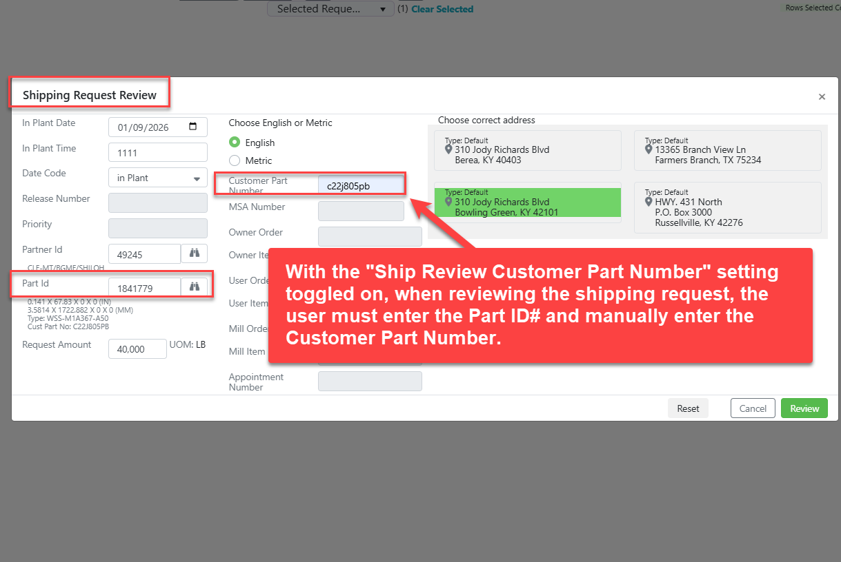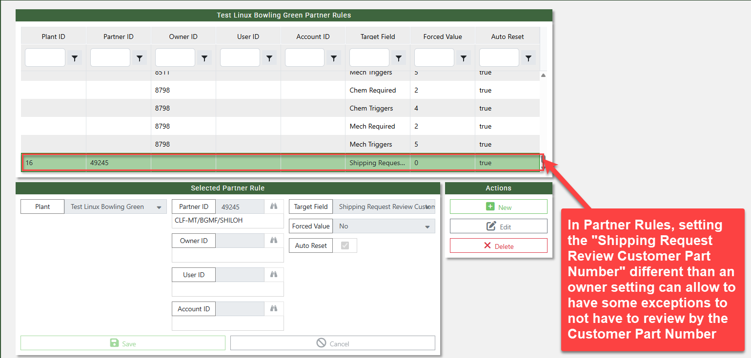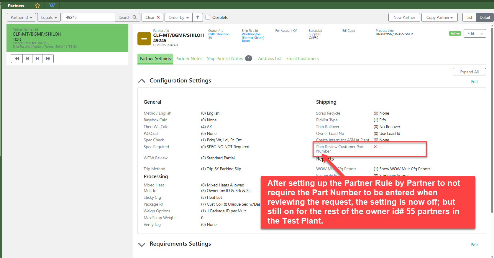 A new partner setting has been added as part of a corrective action. When this setting is turned on, users reviewing a shipping request will be required to enter both the Part ID number and the customer’s actual part number. This setting can be toggled on or off in the Partner Maintenance screen and can also be updated in bulk through the IT Screen, Partner Rules where it can be controlled at multiple levels, including plant, owner, partner, user, and Account ID.