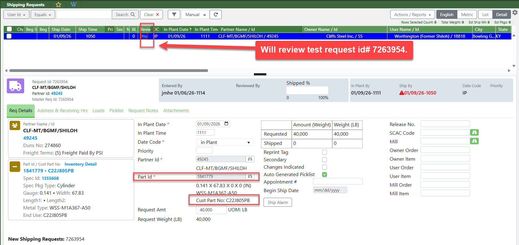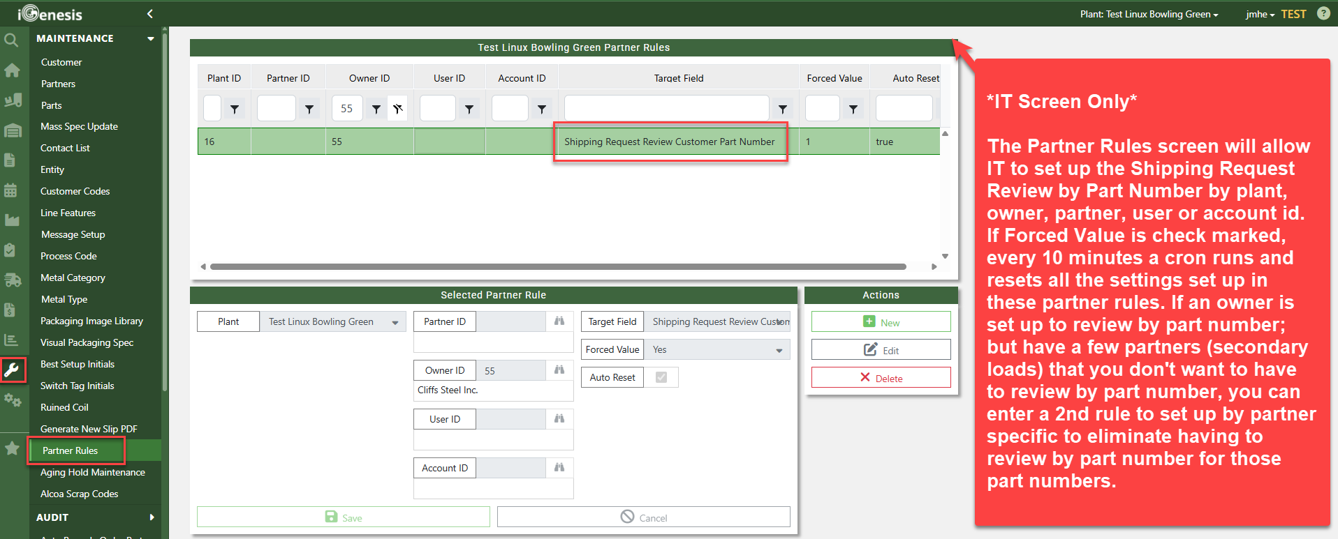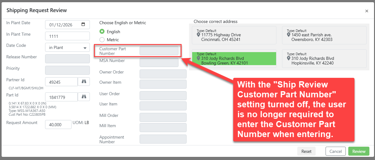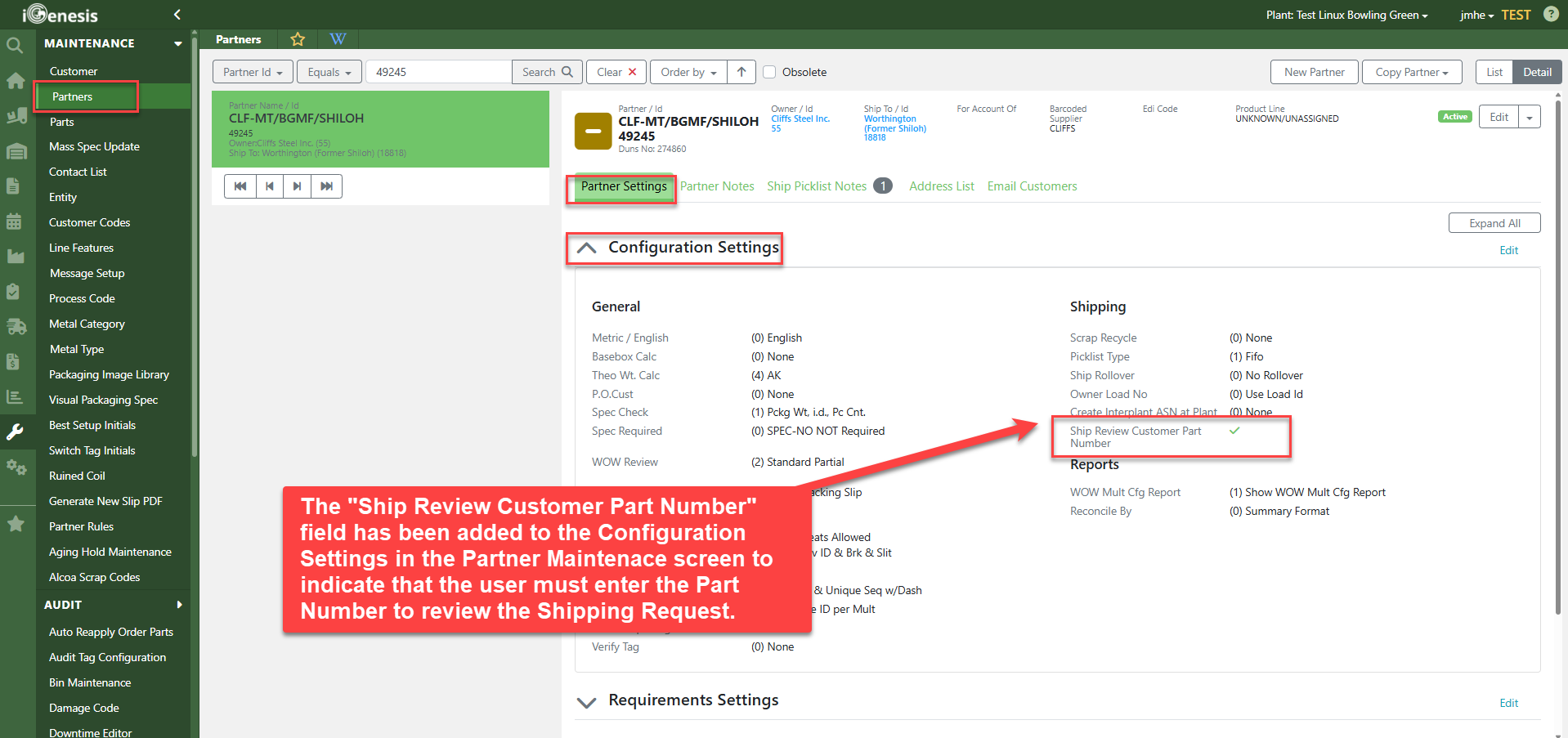A new partner setting has been added as part of a corrective action. When this setting is turned on, users reviewing a shipping request will be required to enter both the Part ID number and the customer’s actual part number. This setting can be toggled on or off in the Partner Maintenance screen and can also be updated in bulk through the IT Screen, Partner Rules where it can be controlled at multiple levels, including plant, owner, partner, user, and Account ID.