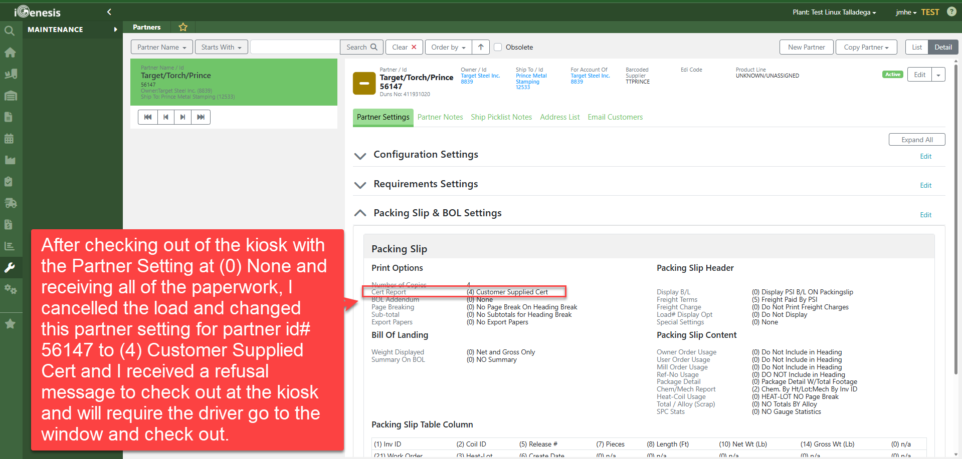 In a situation where a partner has paperwork that is attached to the load or want to ensure the load is checked out by a PSI Shipping Clerk from the Load Schedule to ensure the requirements for that partner are met, the CSR can change a Partner Setting to refuse self checkout on the kiosk.