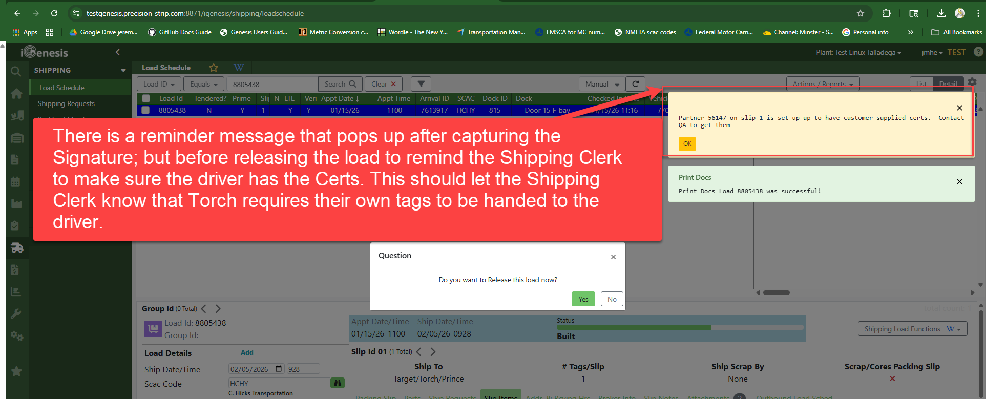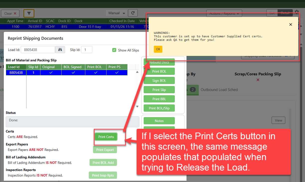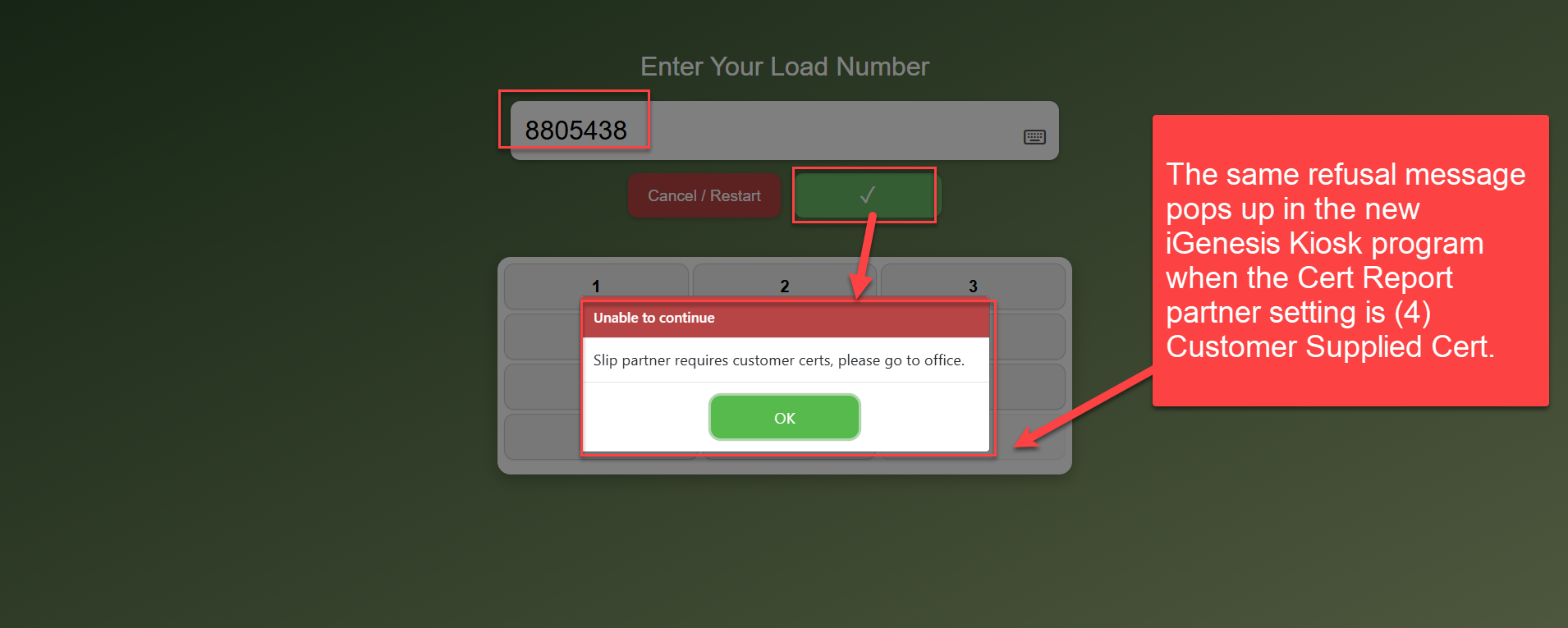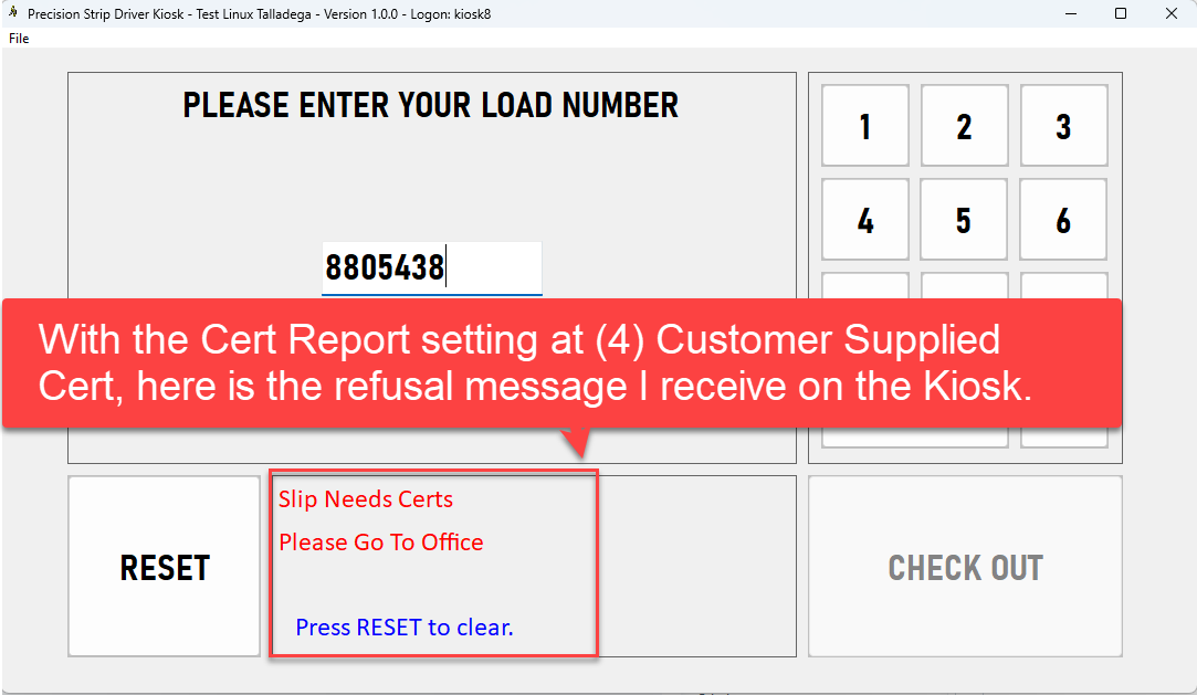 If you change the Cert Report setting to (4) Customer Supplied Cert, it will not allow Kiosk Check Out and relays a refusal message to the driver after entering the Load Number saying: "Slip Needs Certs Please Go To Office"