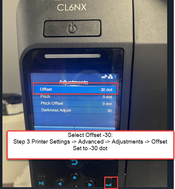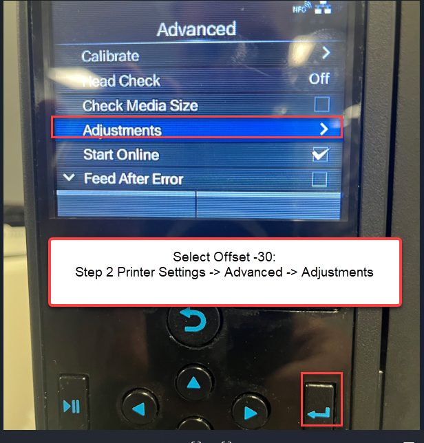 Step 3: Printer Settings -> Advanced -> Adjustments -> Offset = -30 dot